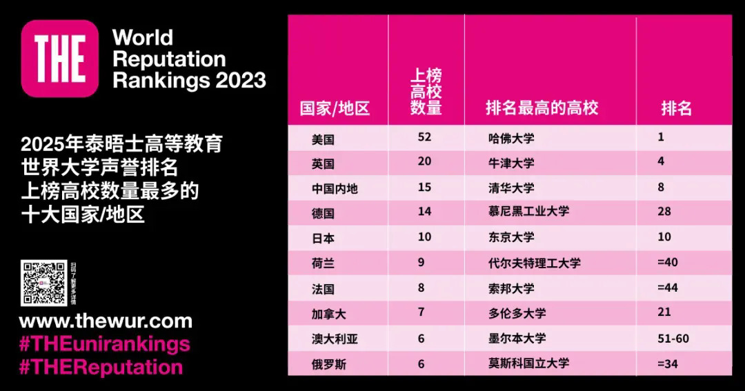 以上就是2025年泰晤士高等教育世界大学声誉排名详情,不同于大学排名,声誉排名可以更直观地了解到大学的国际声誉和影响力,帮助各位同学准确筛选学校!