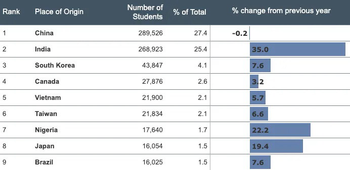 2022/23学年共有289,526名中国大陆留学生在美国就读,中国依旧是美国最大的留学生群体生源地,约占全美国际学生总数的 27.4%,攻读研究生学位的国际新生达到近 18.9 万人。
