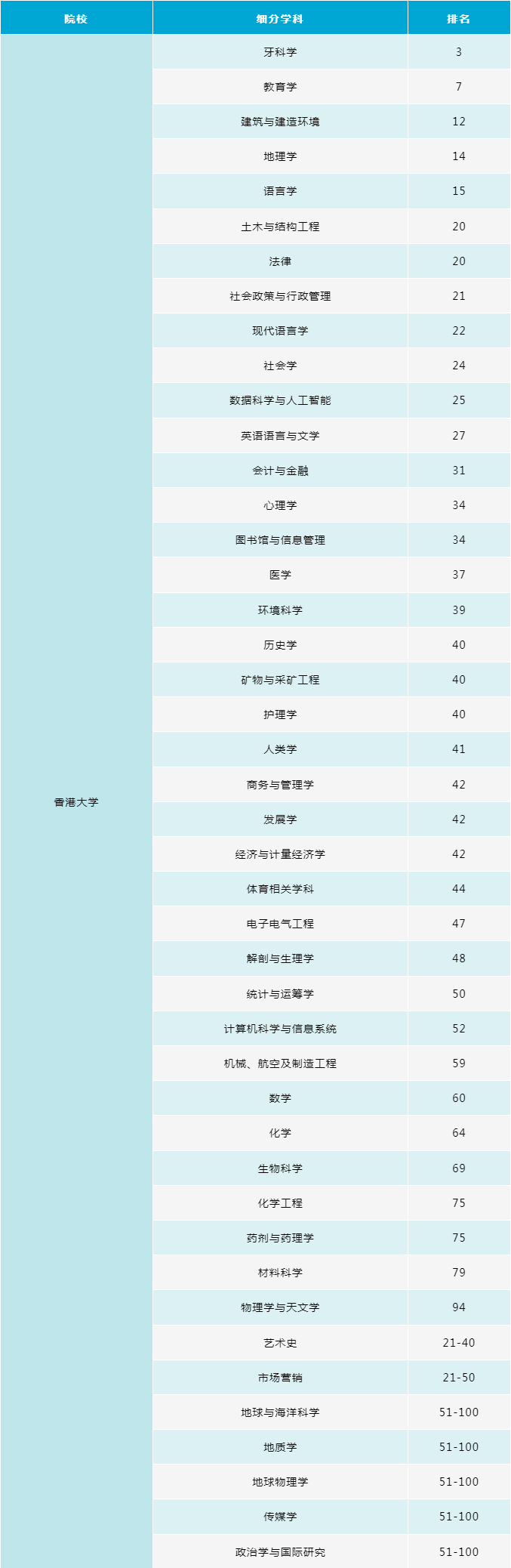 6、社会科学院:法学、教育学、社会政策、语言学等专业排名世界前列,教育学更是香港第一,世界排名第八,法学LLB课程在全港始终保持领先地位。