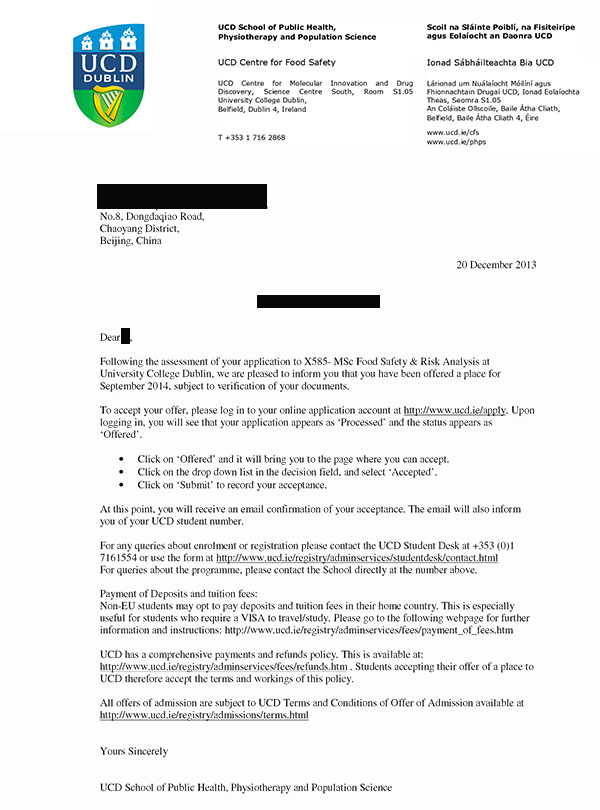 恭喜四川大学王同学获得2014都柏林大学食品安全与风险专业OFFER