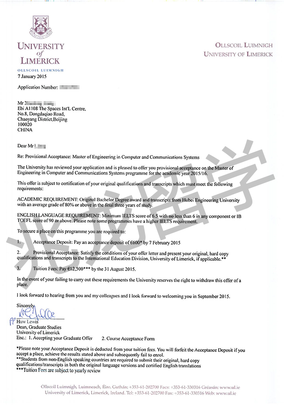 经过兆龙留学爱尔兰留学签证网老师的努力,成功为湖北工程学院梁同学申请到爱尔兰利莫瑞克大学录取OFFER,以下是他的offer分享,在此祝他留学之路一切顺利!
