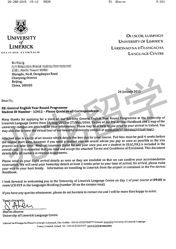 恭喜王同学成功获得爱尔兰利莫瑞克大学录取OFFER