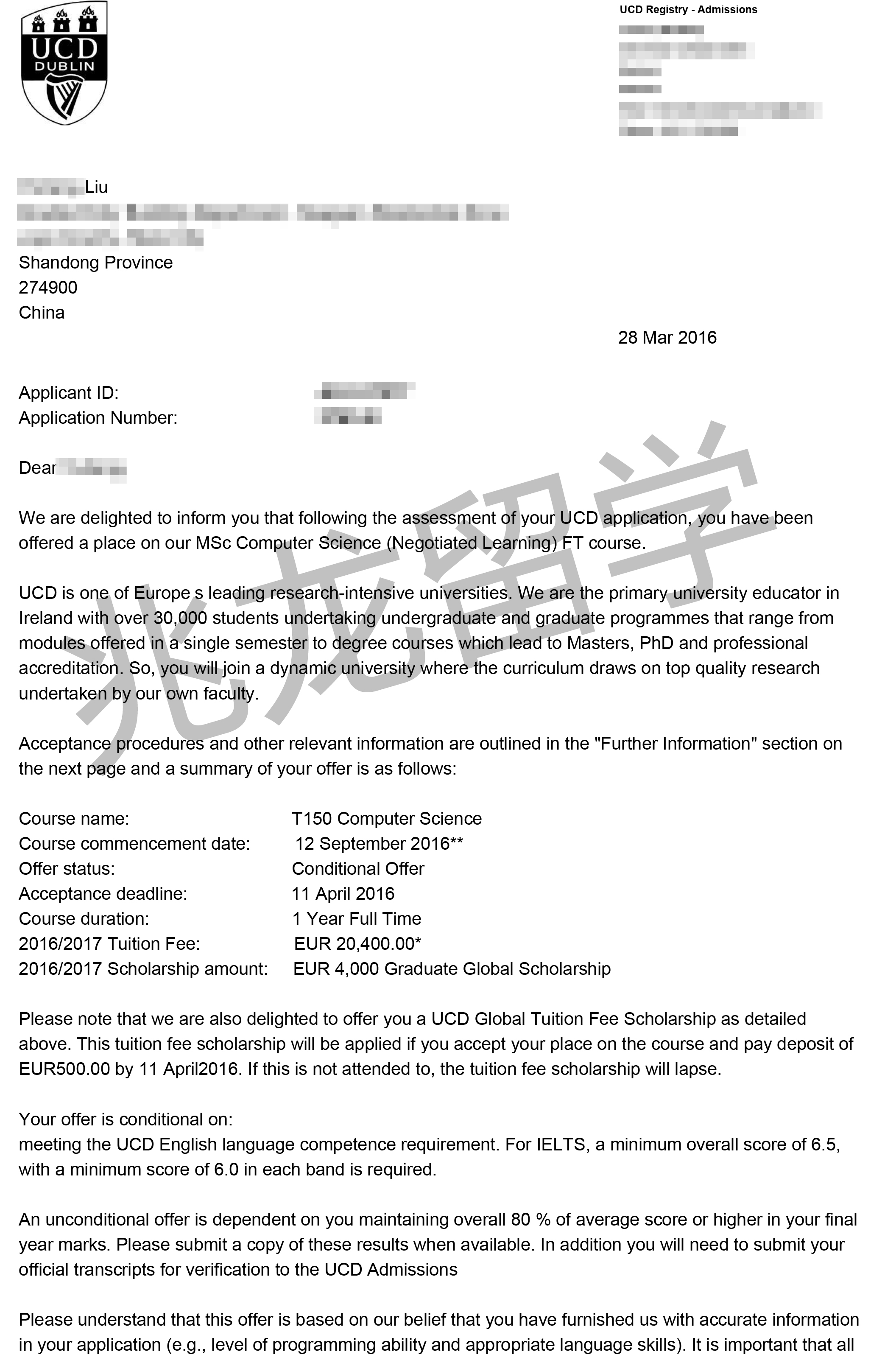 经过兆龙留学-爱尔兰留学签证网老师的努力,成功为刘同学申请到爱尔兰都柏林大学计算机科学硕士OFFER,并获得4000欧元的奖学金,以下是他的offer分享,在此祝他留学之路一切顺利!