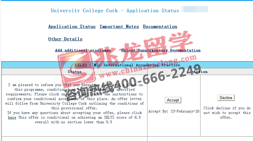 经过兆龙留学-爱尔兰留学签证网老师的努力,成功为里同学申请到爱尔兰科克大学国际会计实践硕士offer,以下是他的offer分享,在此祝他留学之路一切顺利!更多爱尔兰留学申请及爱尔兰签证问题请拨打咨询热线400-666-2249。