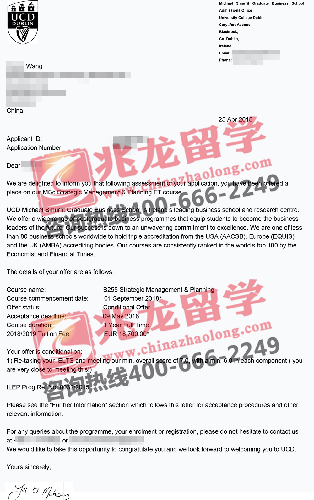 恭喜兆龙为来自武汉东湖学院本科英语专业,2013年毕业的汪同学,成功拿到爱尔兰都柏林大学UCD战略管理与计划Strategy Management and Planning硕士专业offer、UCD Education硕士专业offer、科克大学欧洲商务创新Innovation in European Business专业offer,以及爱尔兰国立高威大学Digital Marketing硕士专业offer共4枚爱尔兰公立大学offer。