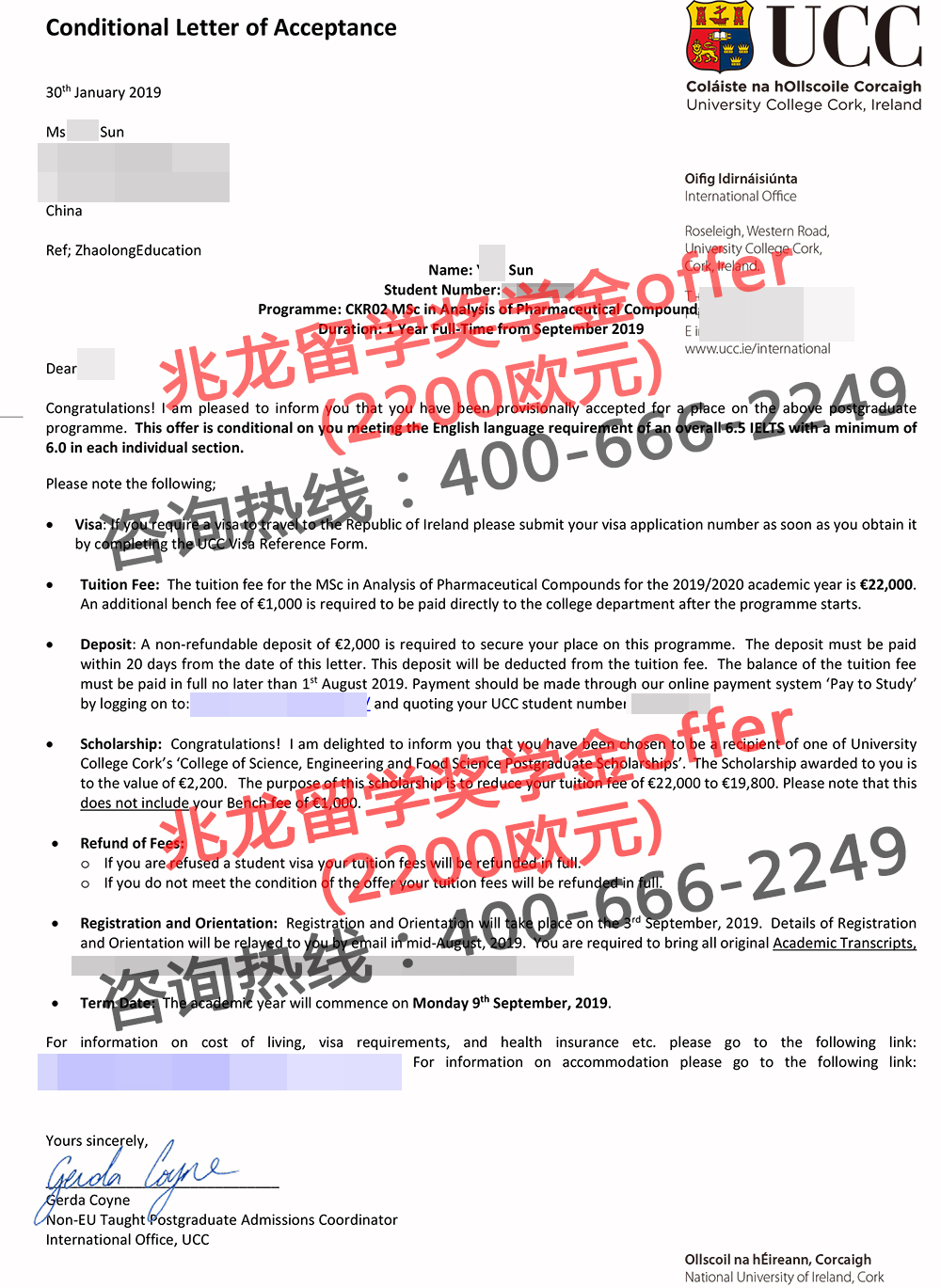 经过兆龙留学-爱尔兰留学签证网老师的努力,成功为孙同学申请到爱尔兰科克大学药物化合物分析硕士2200欧奖学offer,以下是学生offer分享,在此祝他留学之路一切顺利!更多爱尔兰留学申请及爱尔兰签证问题请拨打咨询热线400-666-2249。