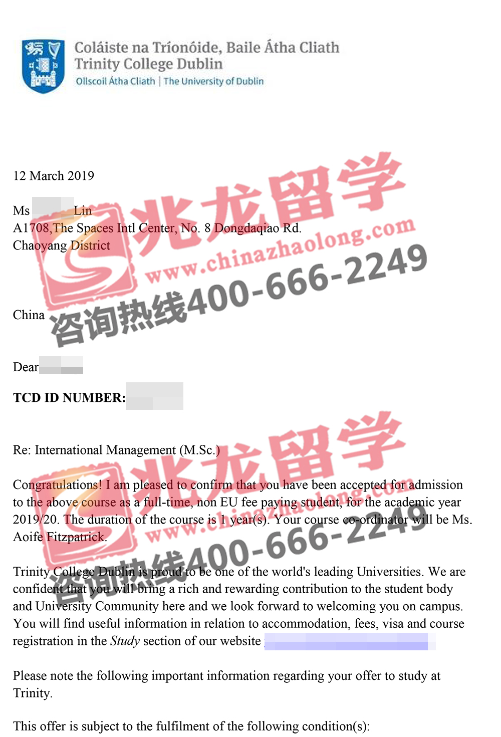 经过兆龙留学-爱尔兰留学签证网老师的努力,成功为林同学申请到爱尔兰圣三一-学院国际管理专业硕士offer,以下是学生offer分享,在此祝他留学之路一切顺利!更多爱尔兰留学申请及爱尔兰签证问题请拨打咨询热线400-666-2249。