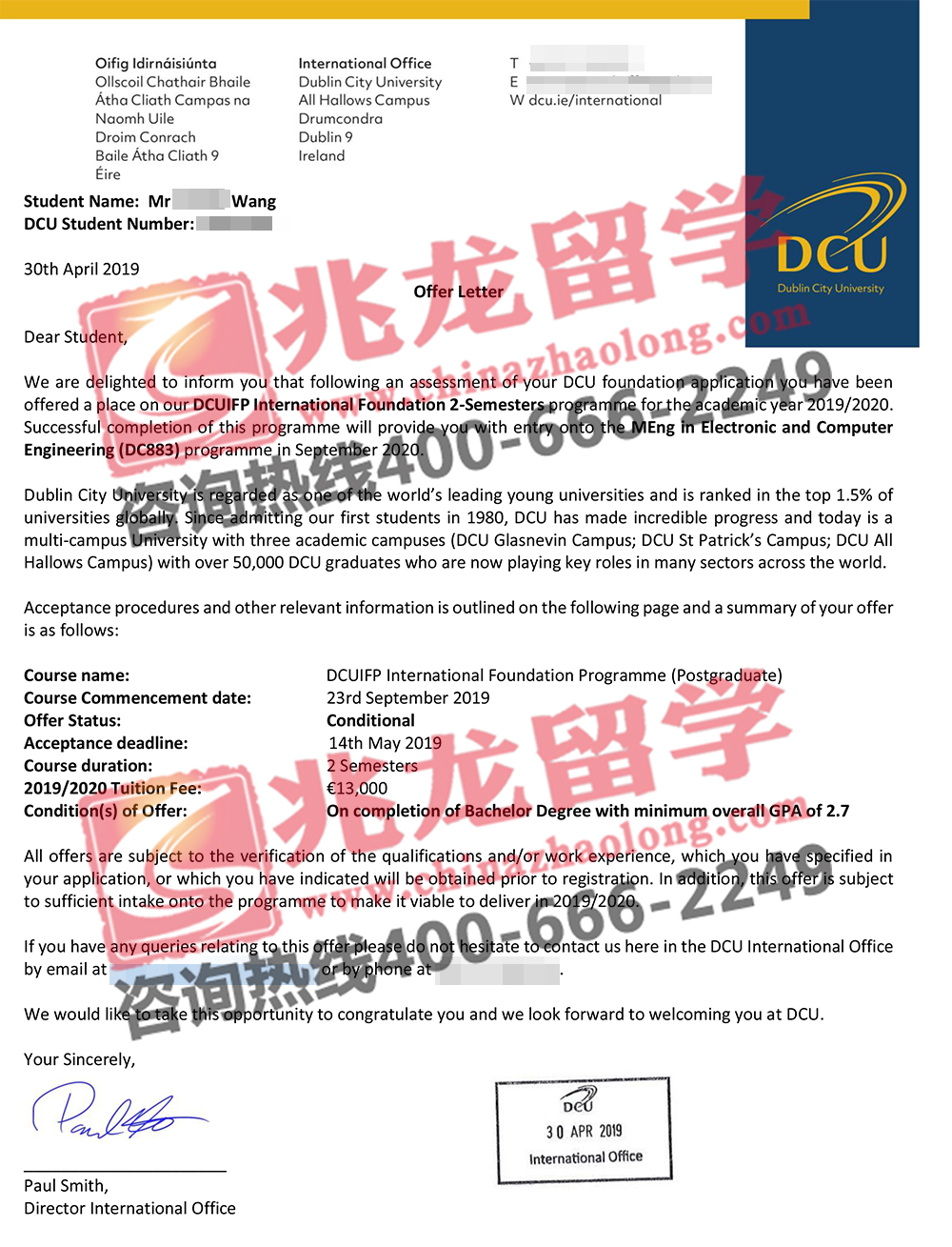 经过兆龙留学-爱尔兰留学签证网老师的努力,成功为王同学申请到爱尔兰都柏林城市大学硕士预科offer,以下是学生offer分享,在此祝他留学之路一切顺利!更多爱尔兰留学申请及爱尔兰签证问题请拨打咨询热线400-666-2249。