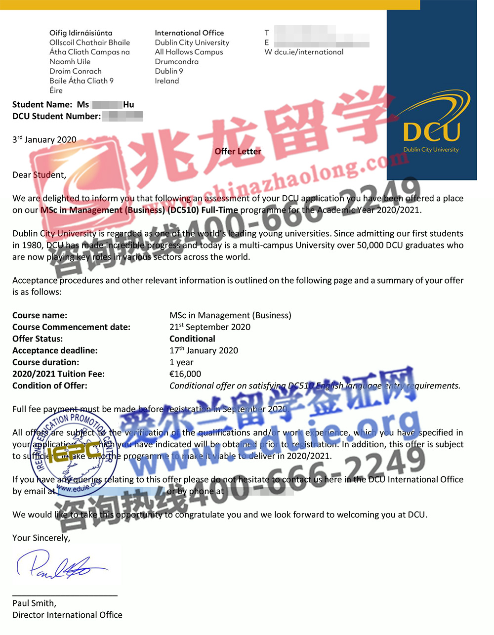 经过兆龙留学-爱尔兰留学签证网老师的努力,成功为胡同学申请到爱尔兰都柏林城市大学管理学硕士offer,祝他在都柏林城市大学能获得更好的提升。以下是学生offer分享,更多爱尔兰留学申请及签证问题请拨打兆龙留学免费咨询热线400-666-2249。