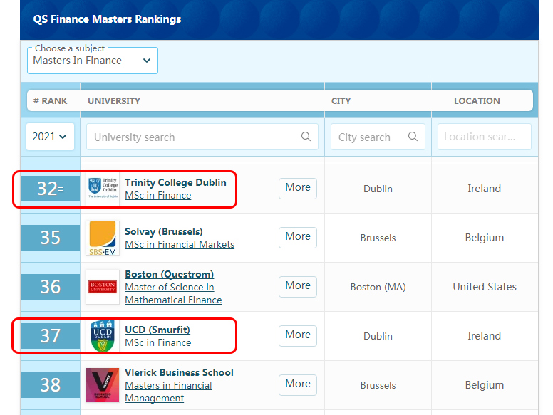 在QS 2021商科硕士排名中,爱尔兰都柏林大学的金融硕士表现非常亮眼,全球排名排名37!