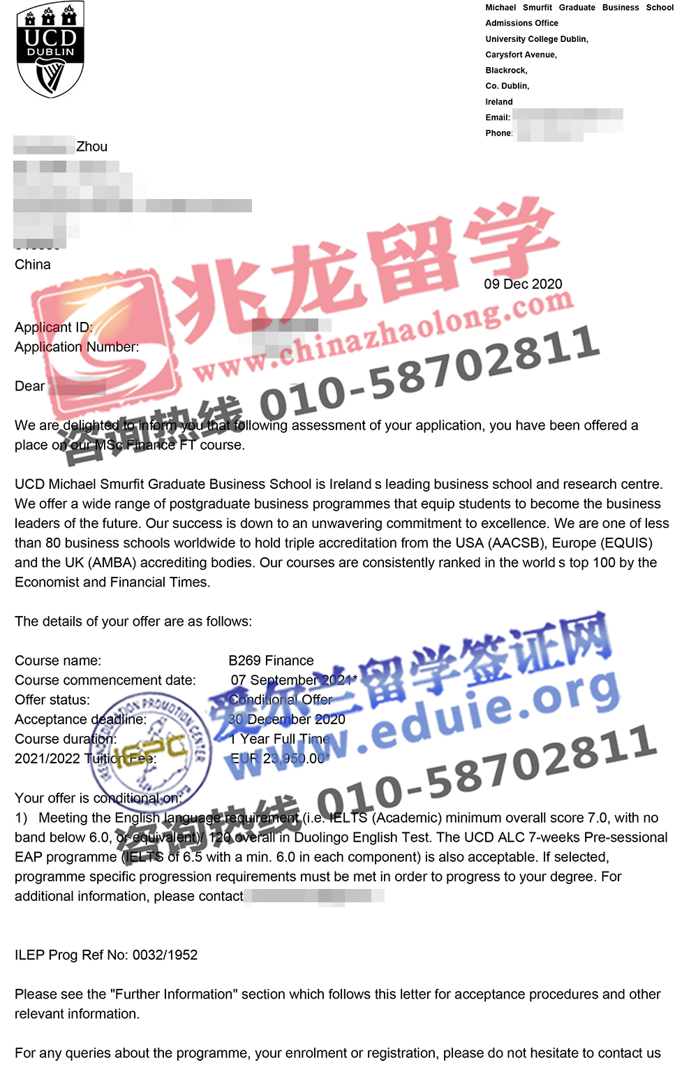 正值2021年爱尔兰留学申请季,恭喜兆龙留学—爱尔兰留学签证网成功为周同学申请到2021 QS全球排名37的都柏林大学金融学硕士专业offer!