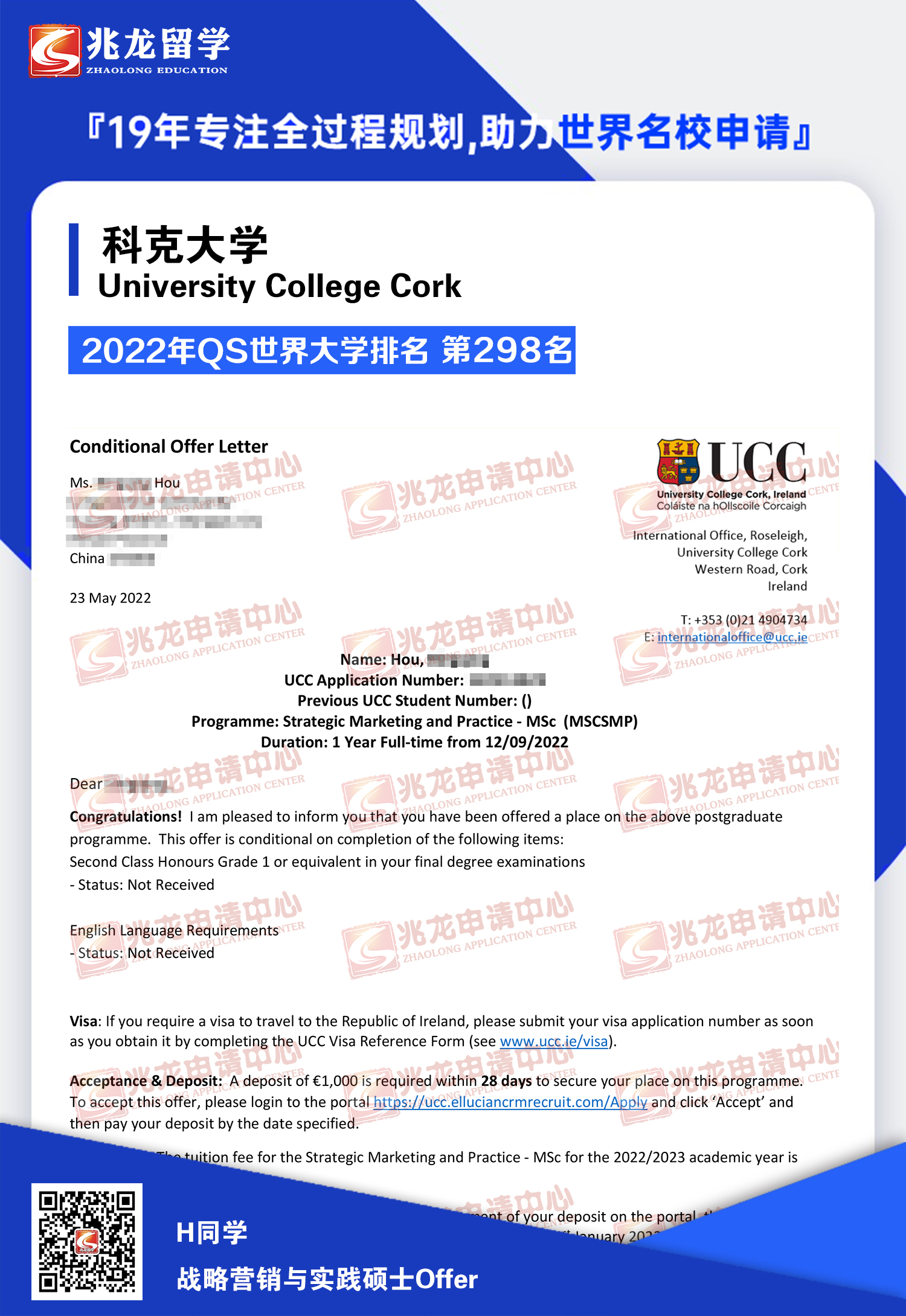 恭喜兆龙留学-爱尔兰留学签证网成功为侯同学申请到爱尔兰科克大学战略营销与实践硕士offer!