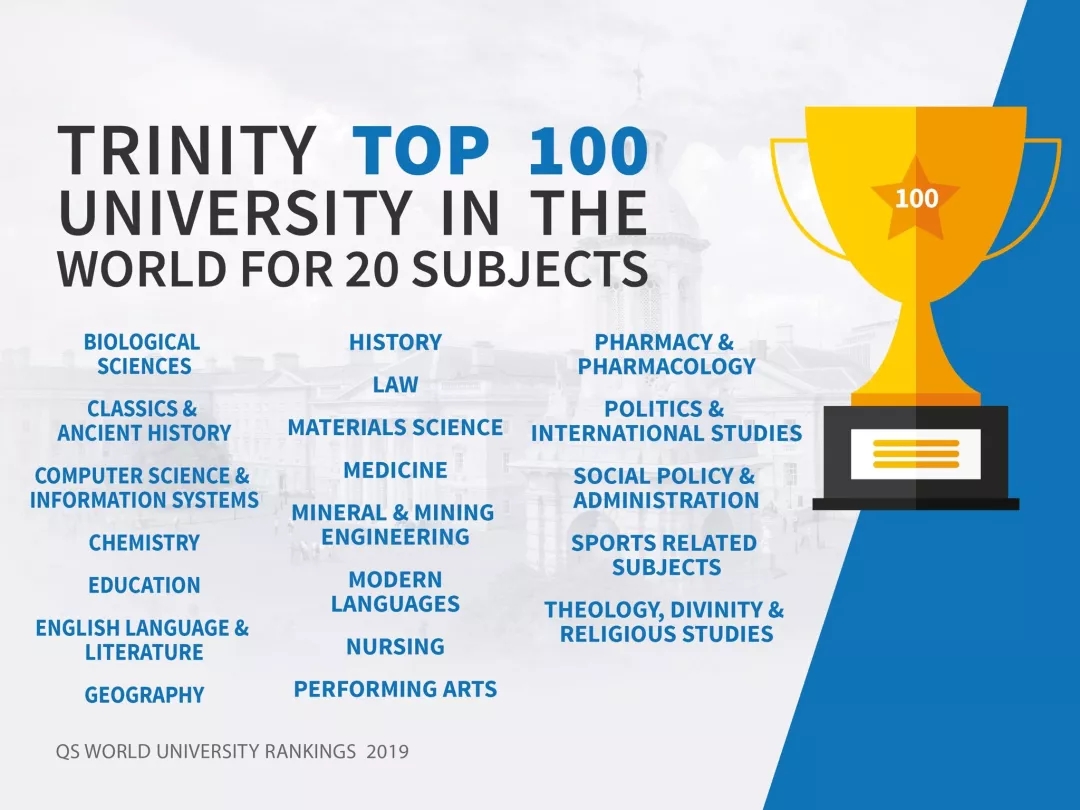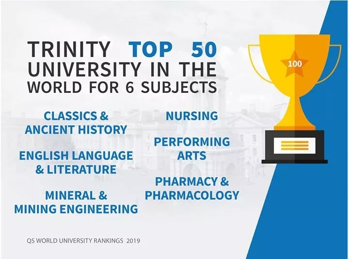 近日,全球高等教育研究机构QS发布了2019年度QS世界大学学科排名。QS作为世界三大最具影响力的全球性大学排名之一,其排名已成为世界上最受欢迎的大学评估比较数据来源。圣三一大学不愧是具有427年历史底蕴的全球百强名校,在今年这份QS世界大学学科排名中,圣三一再次以实力服人!!!有6个学科位居世界前50名,20个学科进入全球100强,并且有29个学科爱尔兰排名第1!