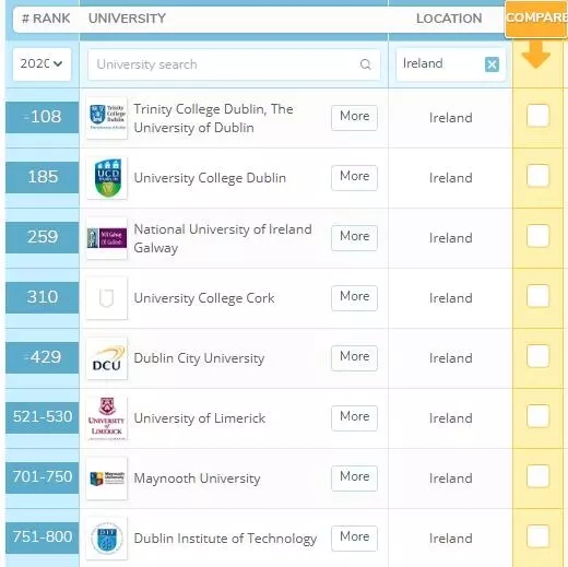 QS世界大学排名从六大衡量标准对世界上各个国家和地区共1000所高校进行排名。衡量标准包括:学术声誉、雇主声誉、教师/学生比例、文献引用数、国际教师比例以及国际学生比例。圣三一大学在六项内容当中的五项都是在爱尔兰所有高校中表现最好的大学。