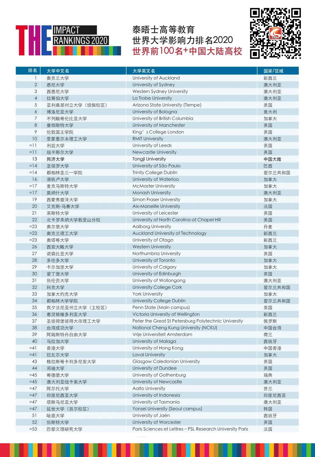 2020年泰晤士高等教育世界大学影响力排名TOP50