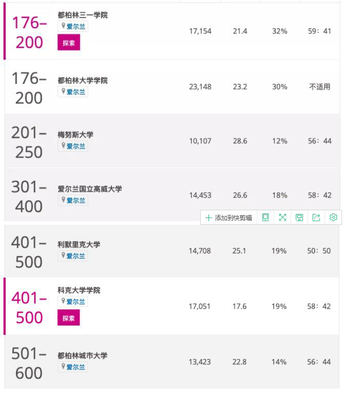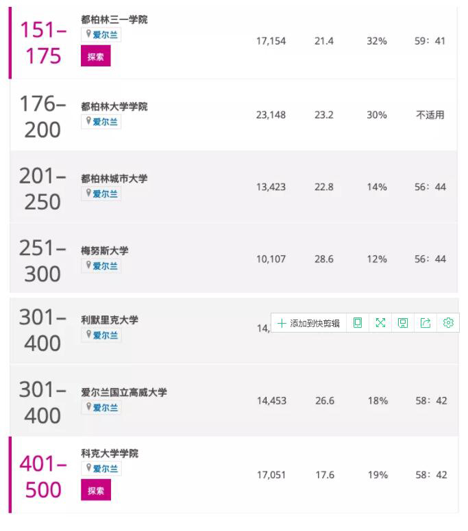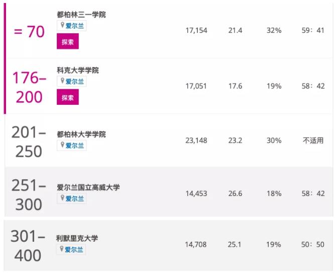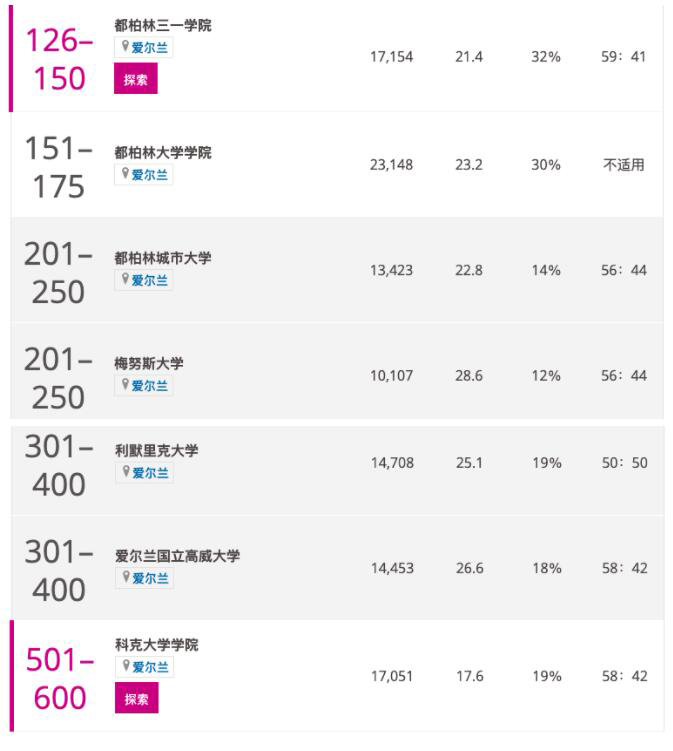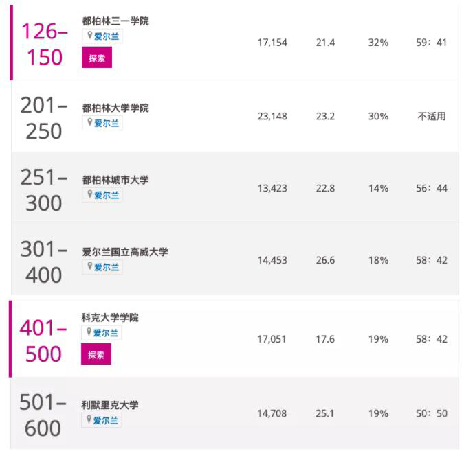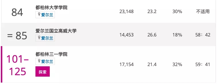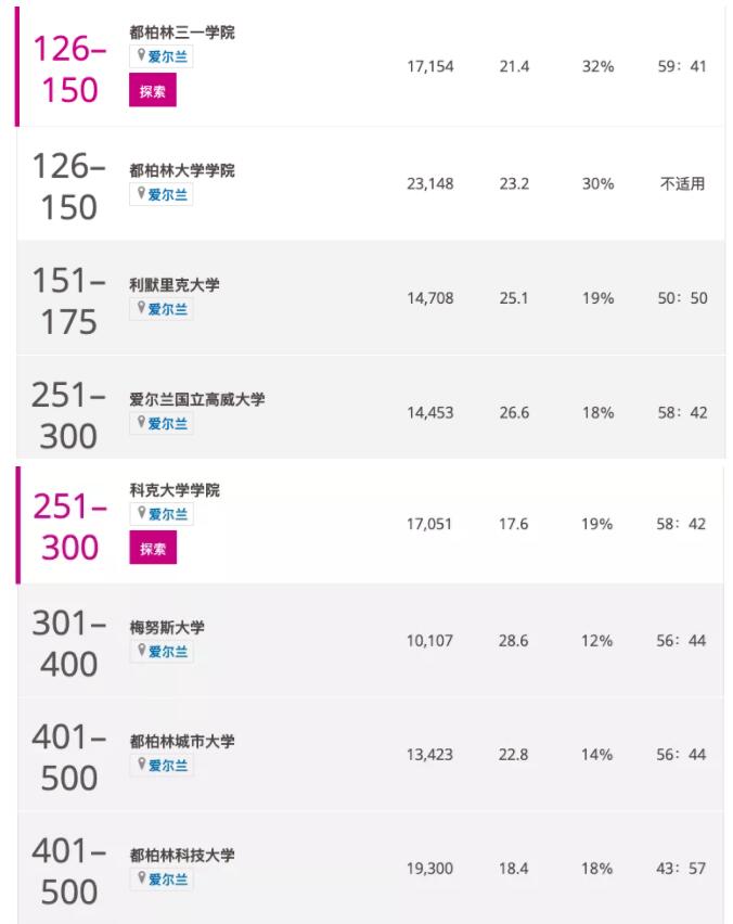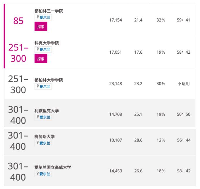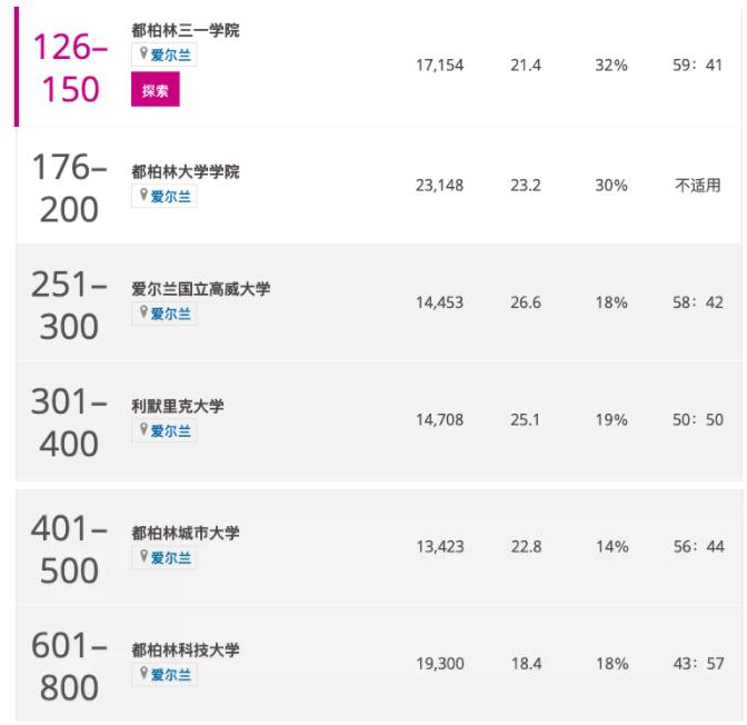 在工程技术领域,爱尔兰共有6所大学上榜,排名最靠前的是圣三一学院(126-150)。