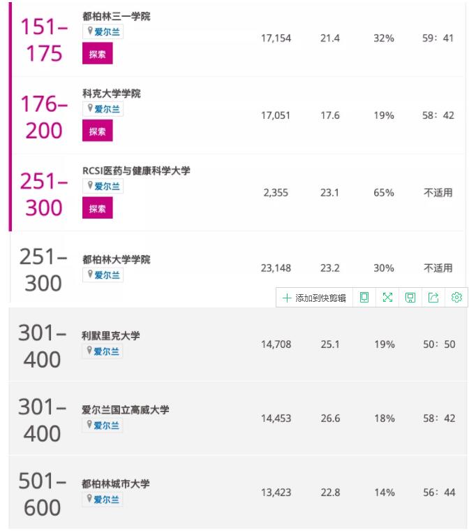 在临床与临床健康领域,爱尔兰共有7所大学上榜,排名最靠前的是圣三一学院(151-175)。