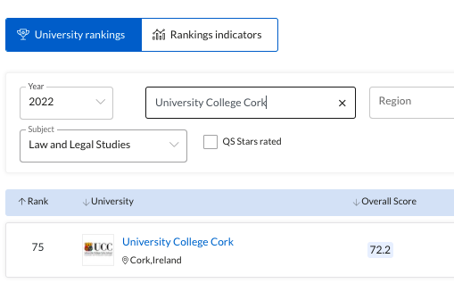 近日,2022QS世界大学学科排名发布!QS学科排名确定了特定领域的世界领先学校,同时考虑了学术声誉、雇主声誉和研究影响。科克大学法学院在这些领域的实力使其在2022年的前100名中攀升25位至世界第75名,成为爱尔兰第一。