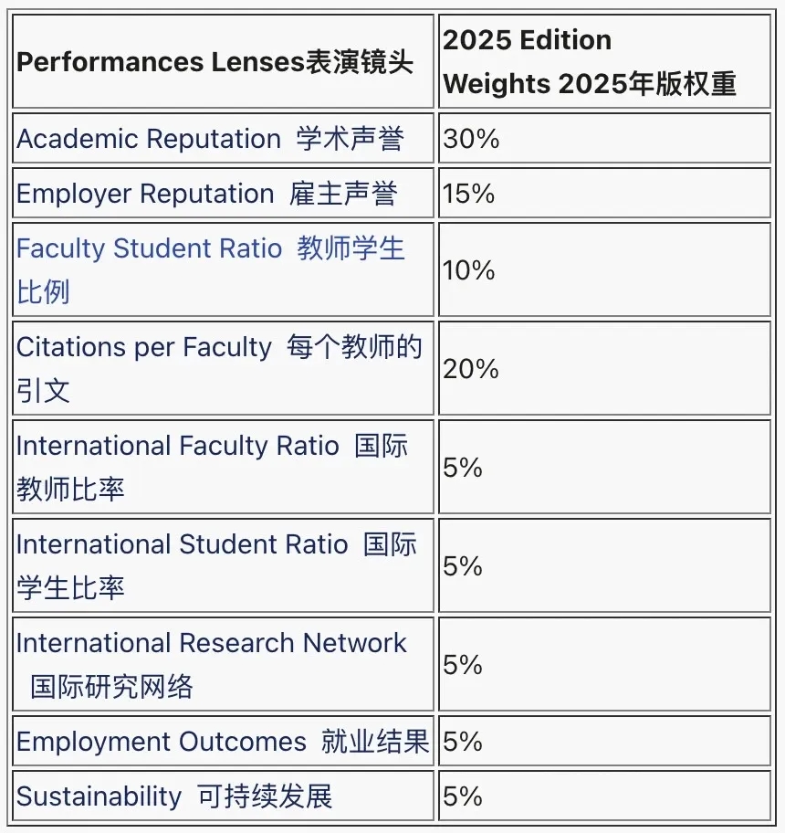 在去年,QS世界大学排名自发布20年以来首次调整排名方法,在六项基础指标以外新增国际研究网络、就业成果、可持续性这三项指标,并相应调整了权重(具体指标详见下图),一瞬间就引起了学校排名的“大洗牌”。