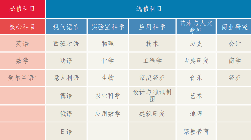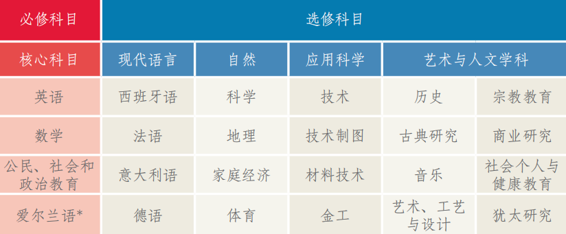 在5年级和6年级的时候,学生们为一项名为毕业证书的大学入学考试做准备。学生们学习核心科目英语和数学,并从30个科目中选出另外3-5个选修科目。对于海外学生来说,如果他们在爱尔兰以外的地区已经接受了11岁以下的小学教育,爱尔兰语不是强制课程。