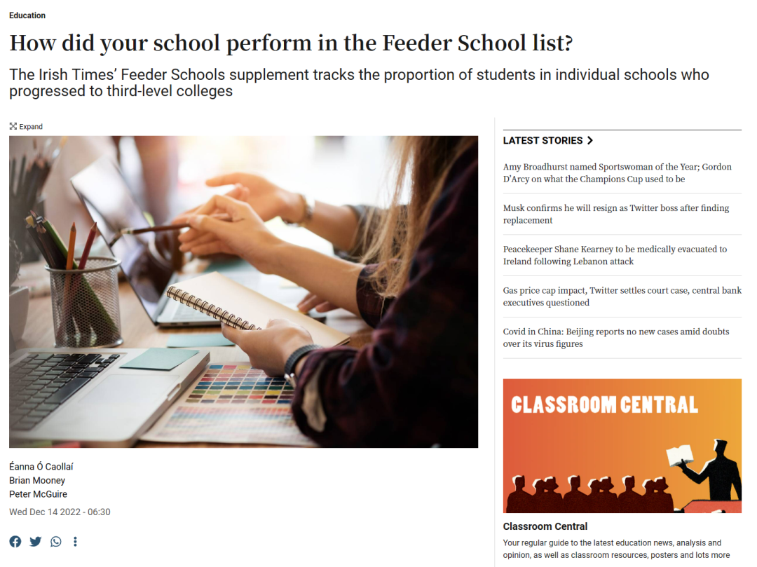 爱尔兰时报》副刊Feeder Schools发布了爱尔兰2022年度各中学升入重点大学的统计数据。2022年,爱尔兰中学升大学的升学率达到79%,这一成绩让爱尔兰的升学率稳居欧洲榜首。