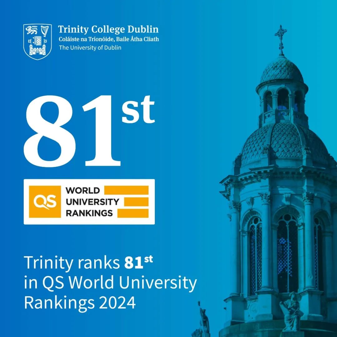 在2024年QS世界大学排名中,都柏林圣三一大学排名稳中有升居世界第81,相比2023年提升了17位,继续稳居爱尔兰第一,也是爱尔兰唯一一所全球前150的大学。