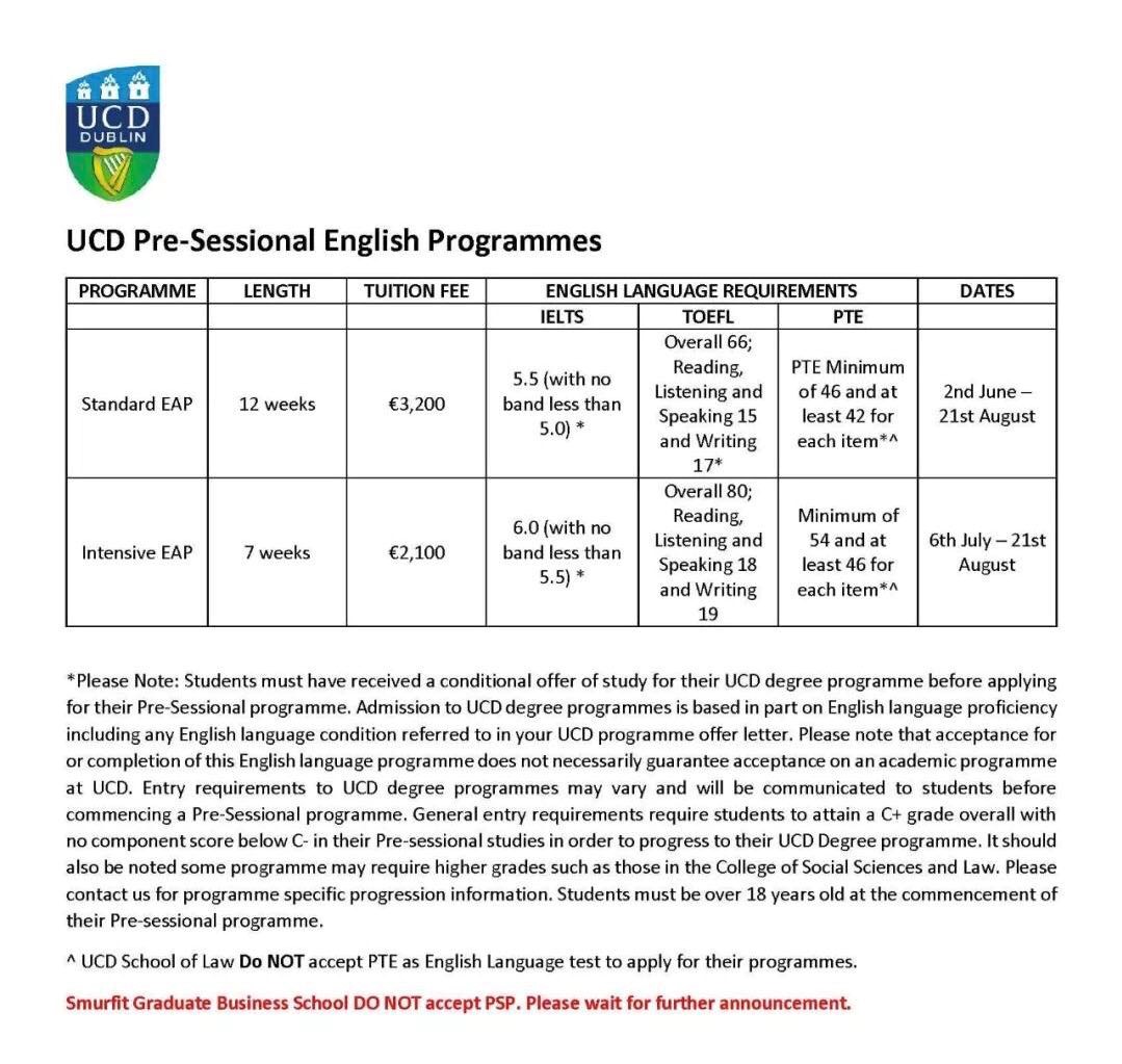 近期有小伙伴反应,担心雅思官方2月份取消考试将会影响自己申请短期语言课。小伙伴莫要太担心,我们的语言课名额充足。UCD 的语言课会在开课的前一月截止申请 (留足时间办签证)。小伙伴们报名之后的英语考