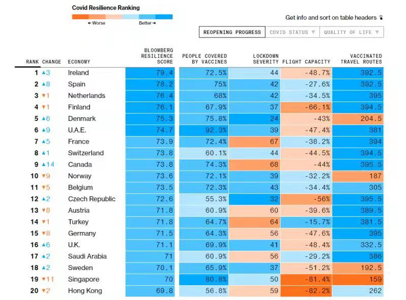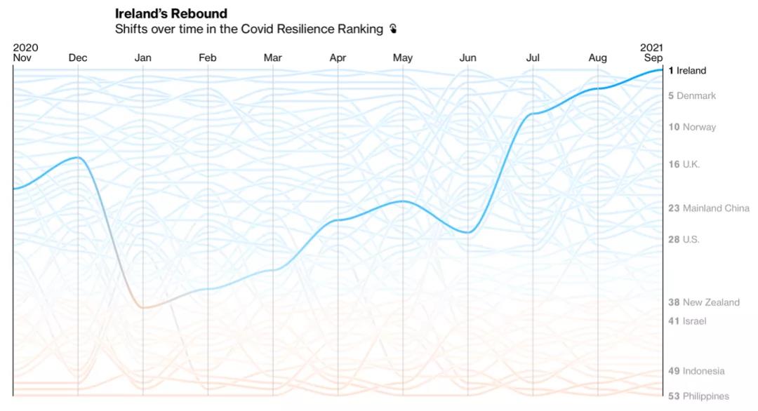 据彭博社9月28日报道,在其“抗疫能力”排行榜上,爱尔兰已从今年1月初的第四十位跃升为世界第一位: