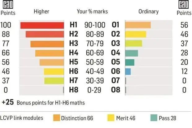 然后学生可以将获得的百分制分数转换成对应的CAO点数。这些点数叠加可用来申请理想的学校和专业。不过,学生申请的大学专业也需要与高考选取的科目有所关联。