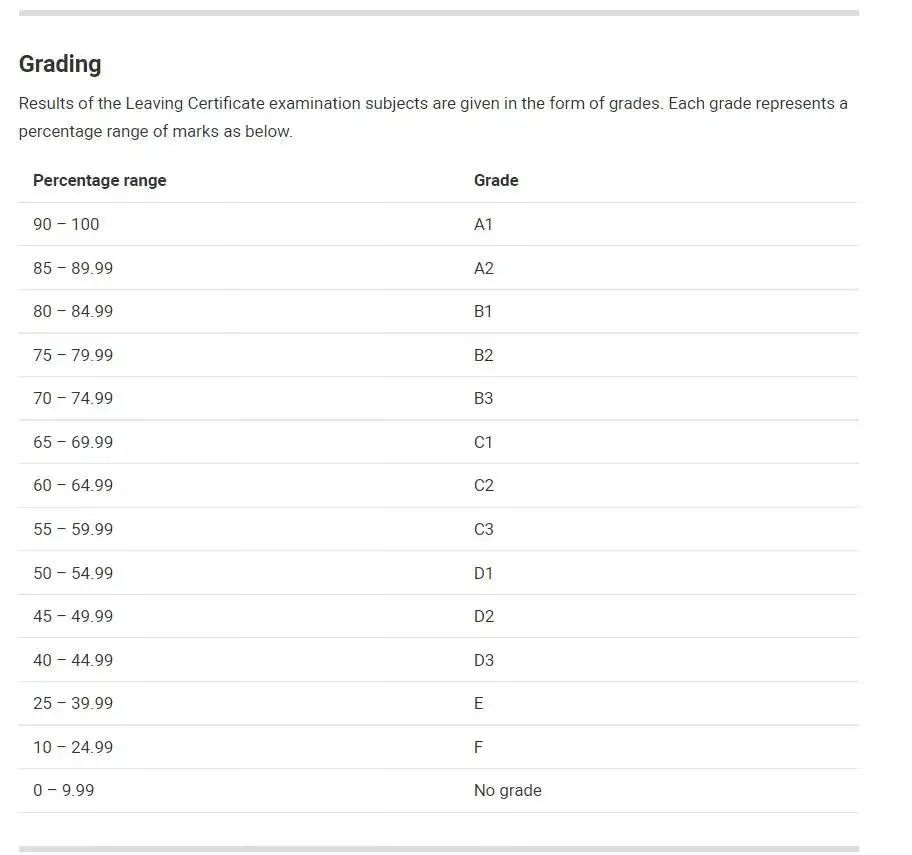 爱尔兰高考的满分为625分(六门课单科成绩为满分100分,其中数学只要及格就获得25分附加分)。学生可以选择不同难度等级的考试:高级、普通、初等(Higher level、Ordinary Level、Foundation Level)。