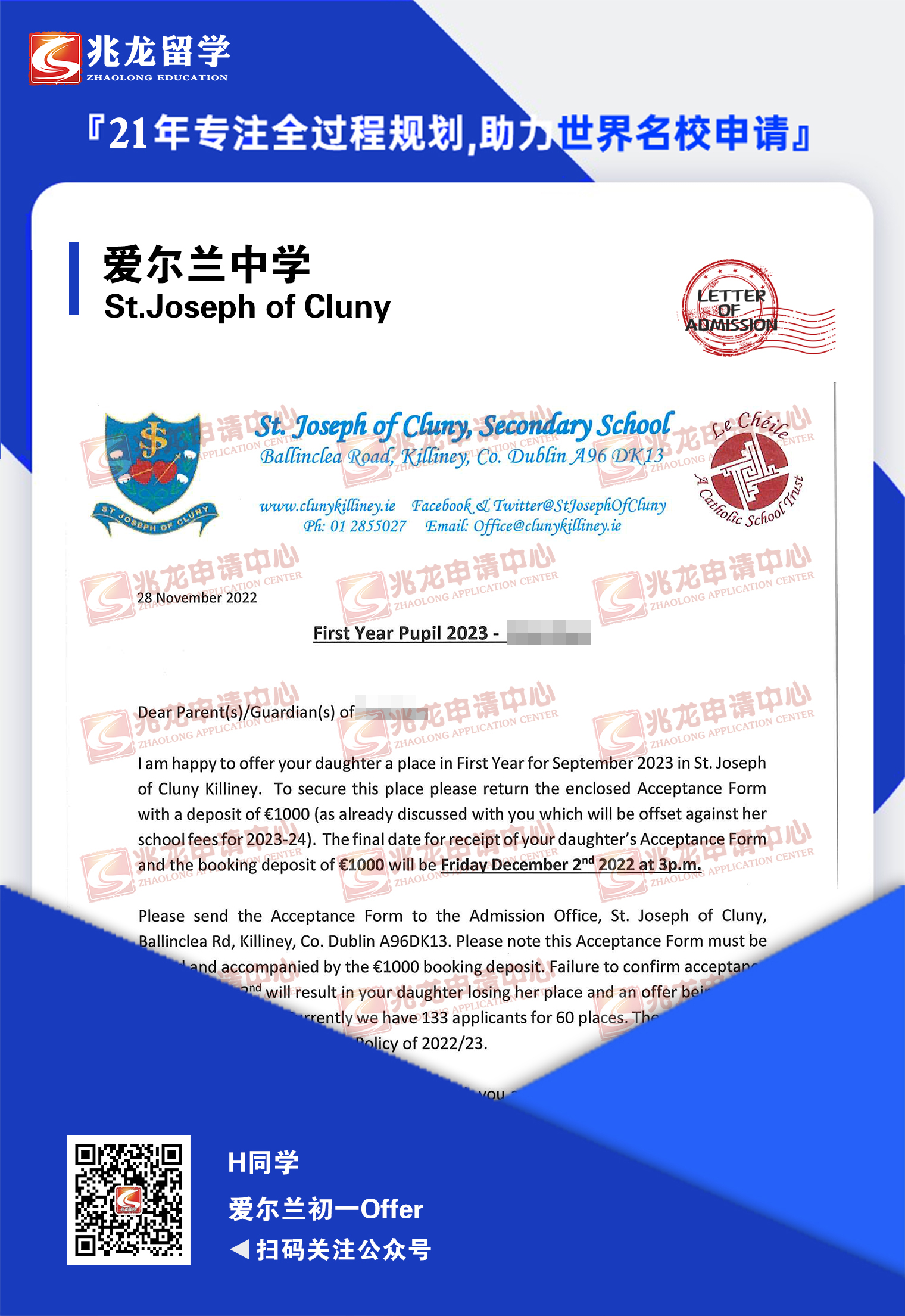 祝贺兆龙学子H同学获得爱尔兰中学St.Joseph of Cluny录取offer