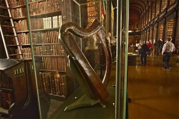 除了拥有古老、珍贵的手稿外,圣三一学院图书馆还拥有爱尔兰最古老的竖琴,这架橡木竖琴制造于15世纪,是橡木和柳木制成,有29根铜弦,被视为爱尔兰的象征之一,也是爱尔兰国徽的原型。