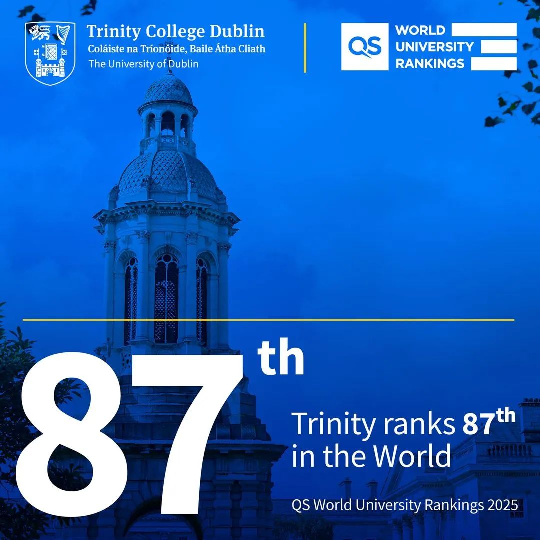 2025 QS世界大学排名第87位,爱尔兰第1位