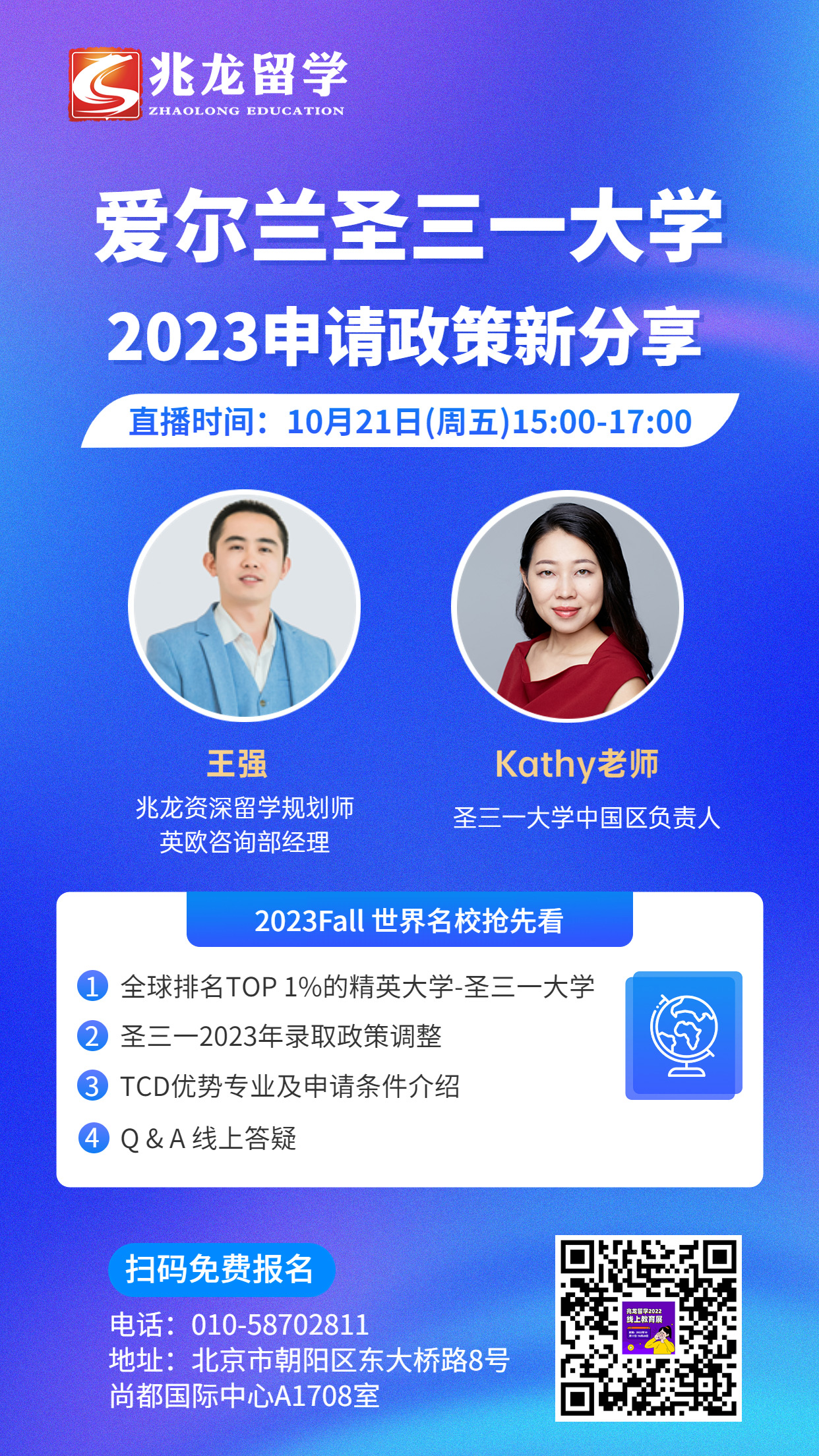 2023Fall申请火热进行中,兆龙留学携手爱尔兰教育署举行的2022秋季线上院校教育展现已拉开帷幕,2022年10月21日(周五)15:00-17:00,兆龙留学特邀爱尔兰圣三一大学,为大家准备一场关于2023申请的知识盛宴。