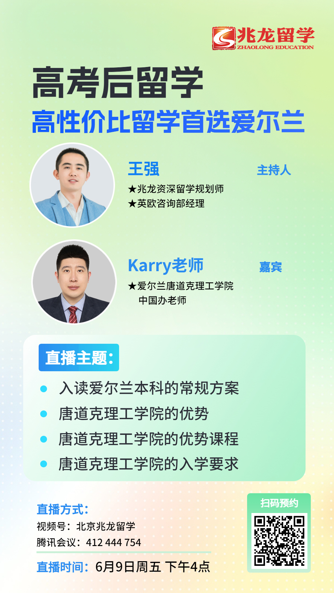 了解更多爱尔兰留学信息欢迎拨打兆龙留学-爱尔兰留学签证网咨询热线:010-58702811。兆龙留学规划师一对一给予辅导,针对你的个人条件,有针对性的,精准定位,寻找适合你的院校和专业,帮你成功踏入理想的校园。也可关注兆龙留学微信订阅号:beijingzl,随时掌握最新留学资讯!