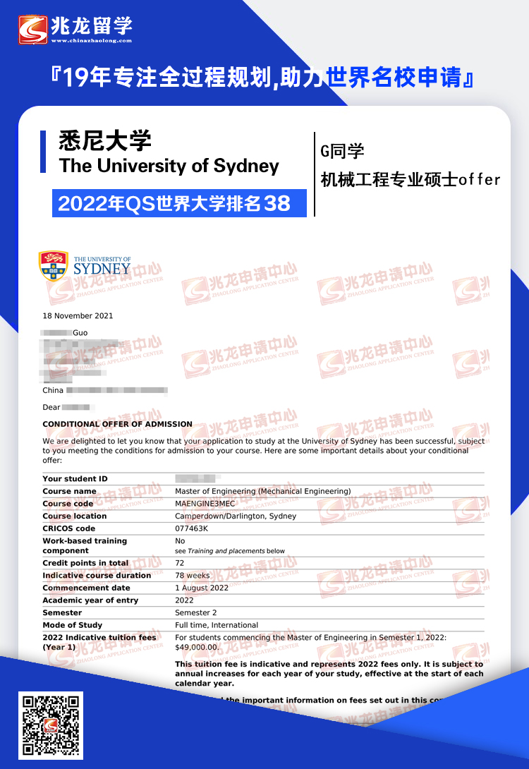 经过兆龙留学澳洲部老师的努力,成功为郭同学申请到澳洲悉尼大学机械工程专业硕士Offer!以下是他的offer分享,在此祝他留学之路一切顺利!更多澳洲留学申请信息请拨打咨询热线010-58702015。