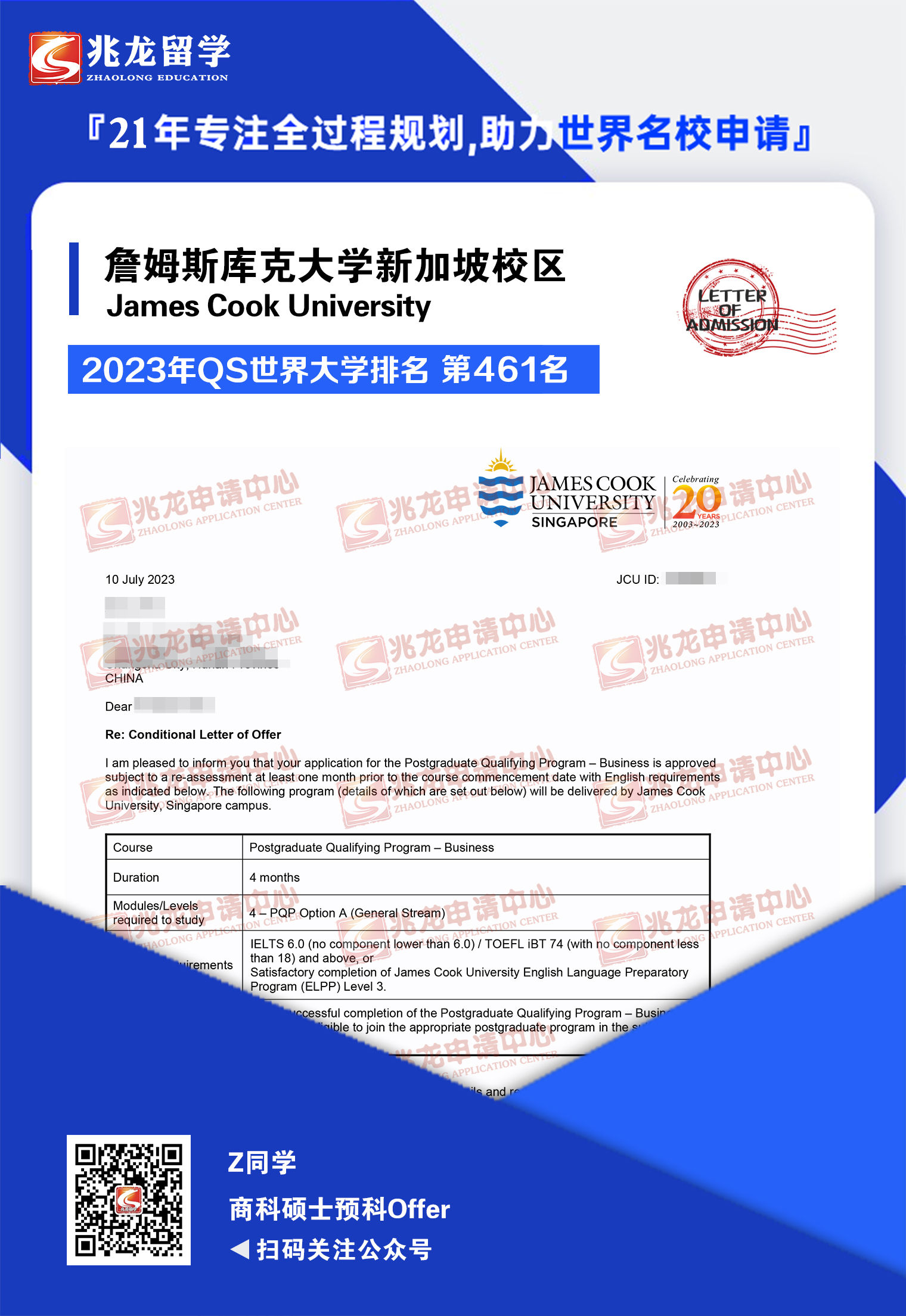 恭喜兆龙留学成功为Z同学申请到詹姆斯库克大学新加坡校区商科硕士预科offer!以下是学生的offer分享,在此祝他留学之路一切顺利!更多留学问题请拨打兆龙留学咨询热线:010-58702811!
