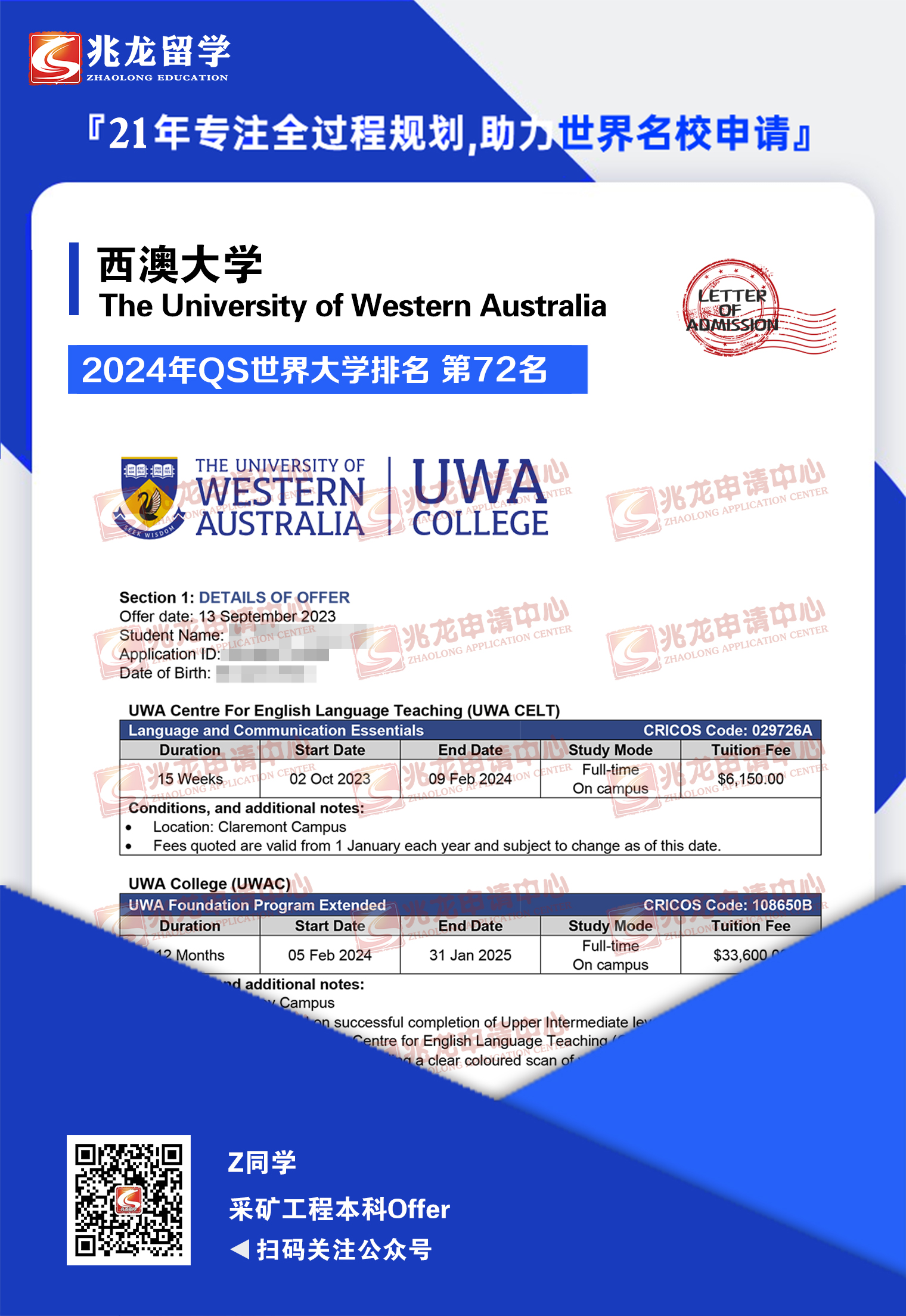 恭喜兆龙留学成功为Z同学申请到澳洲西澳大学工程学士(荣誉学位)采矿工程本科offer!