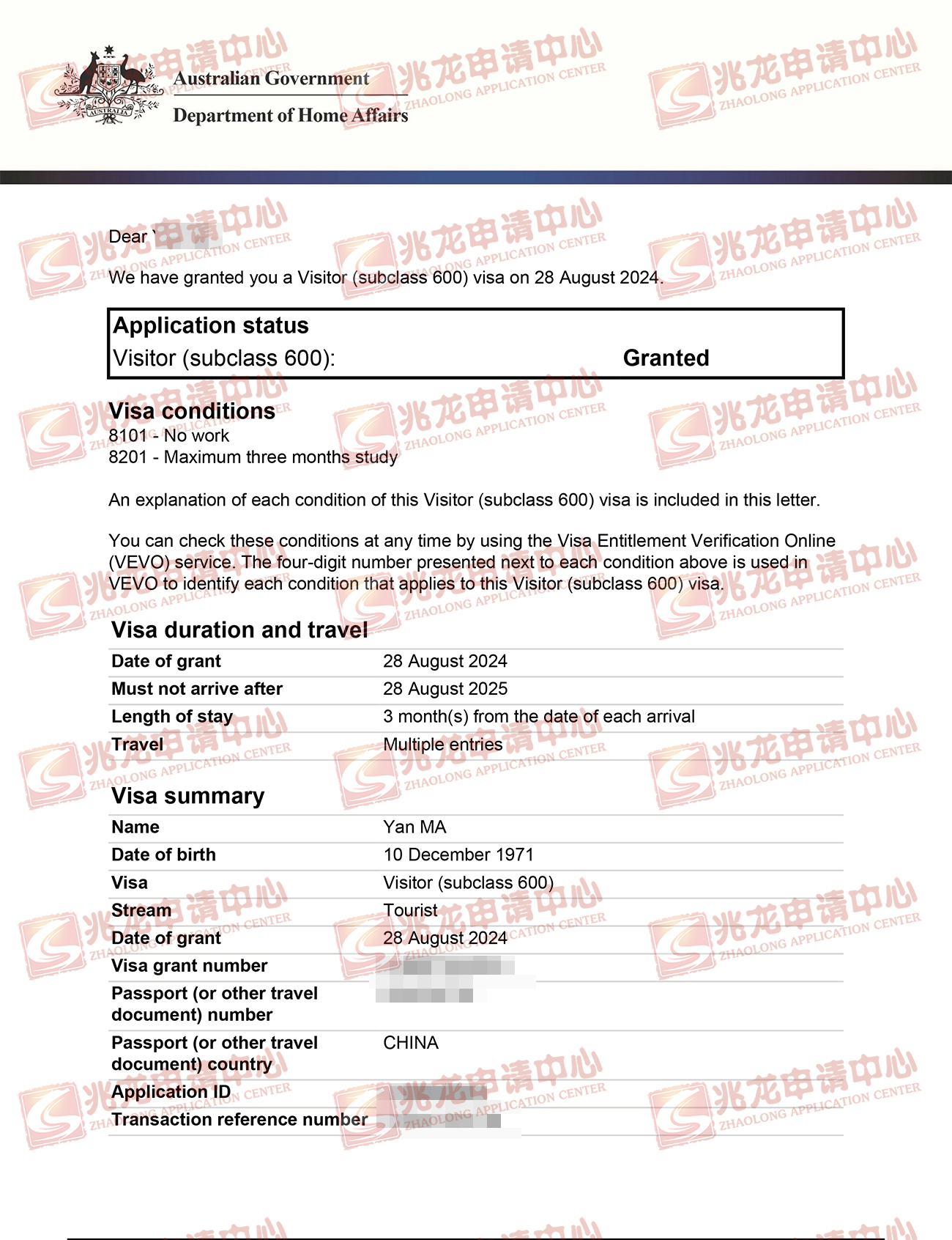 恭喜兆龙成功为M同学父母获得澳大利亚旅游签证,在此祝他们澳洲之旅一切顺利!