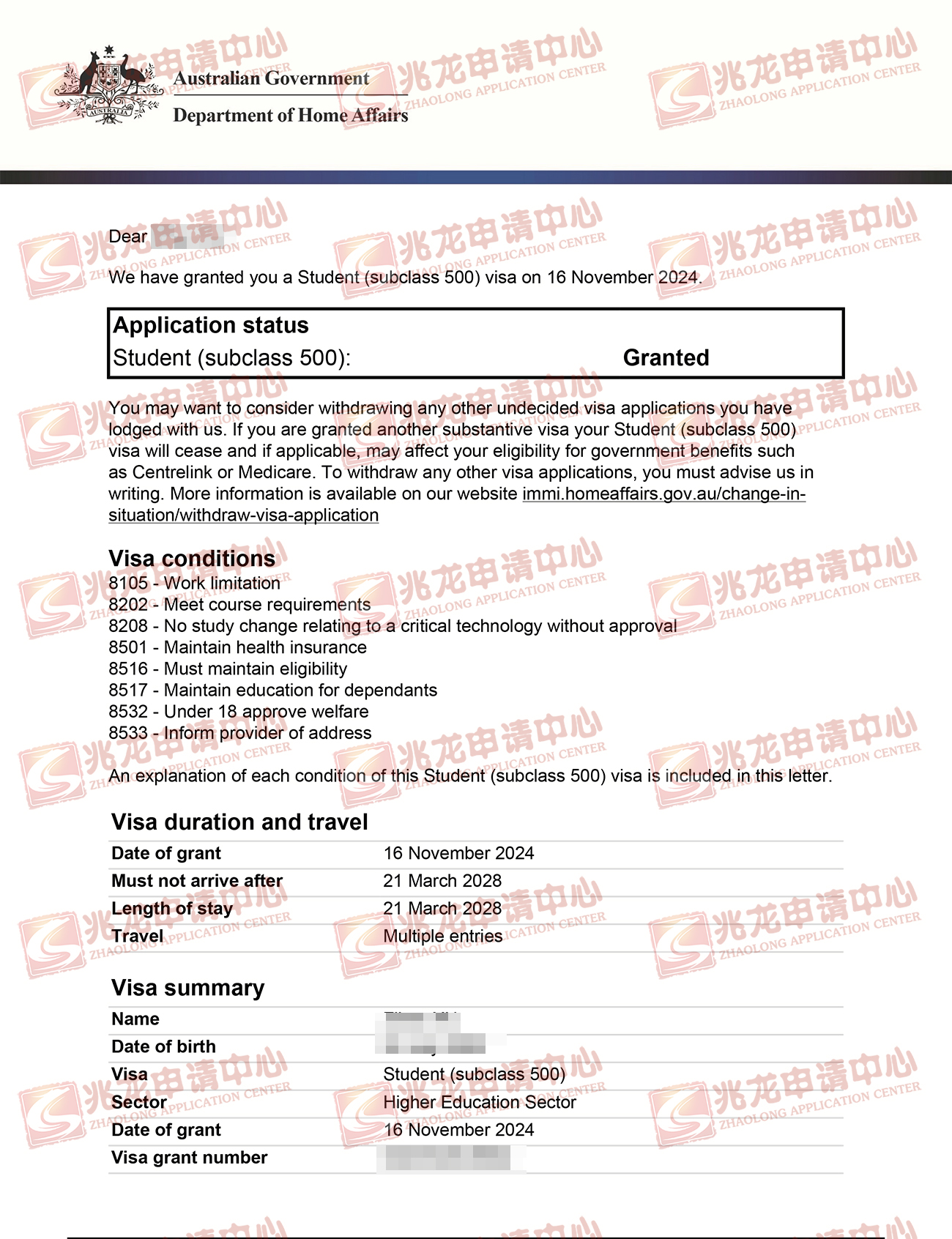 恭喜兆龙留学成功为X同学获得赴悉尼大学读本科的澳洲留学签证,在此祝他澳洲留学之旅一切顺利!