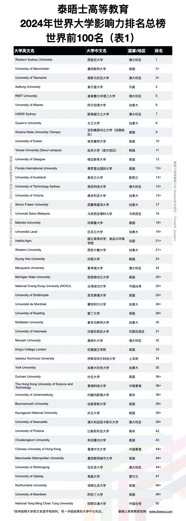 在本次世界大学影响力排名总排名中,仍然是澳洲的西悉尼大学位列榜首!