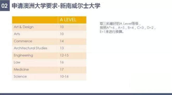 新南威尔士大学,是按照等级换算分数,以总分来录取,表格上所给出的信息是官网给出的建议分数,不能保证一定录取。申请时将选取学生最好的三科A-Level成绩,按照A*=6,A=5,B=4,C=3,D=2,E=1来进行换算。通过换算,如果学生想申请商科的本科的话,A-Level成绩基本要达到AAB,工程类的部分专业也是需要AAA来申请的。