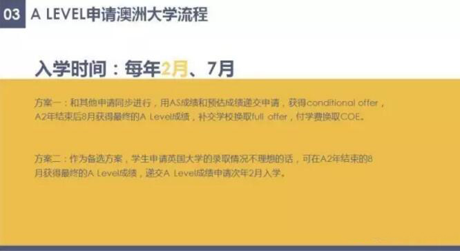 接下来兆龙留学专家介绍下A-Level成绩申请澳大利亚大学的流程。开学时间一般为2月7月,由于A-Level出成绩在8月,一般来说,都是申请次年2月入学,中间会有半年的gap year。学生有两种方案可以选择,一种是和其他国家的申请同步进行,用AS成绩和预估成绩递交申请,获得conditional offer,A2年结束后8月获得最终的A-Level成绩,获得雅思成绩,补交学校换取full offer,付学费换取COE。另一种方案是把澳洲大学作为备选方案,A2年申请时以英国大学为主,如果录取成绩不理想,A2年8月获得最终A-Level成绩后,直接递交A-Level成绩来申请次年2月入学。