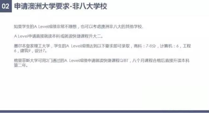 如果学生的A-Level成绩非常不理想,也可以考虑澳洲非八大的其他学校,A-Level申请直接就读本科或就读快捷课程升大二。墨尔本皇家理工大学,学生的A-Level成绩达到以下要求即可录取,商科:7-8,计算机:6,工程6,建筑9,设计7。格里菲斯大学可用2门通过的A Level成绩申请就读快捷课程QIBT,八个月课程合格后直接升读本科第二年。