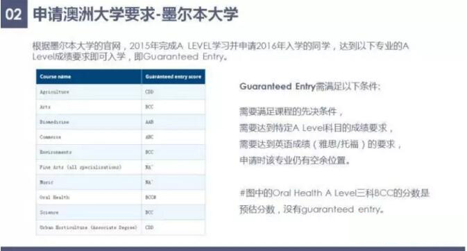 墨尔本大学,官网有给出目前2015年完成A-LEVEL学习并申请2016年入学的同学,达到以下专业的A-Level成绩要求即可入学,即Guaranteed Entry,保证录取。表格中可以看到部分专业的A-Level成绩要求是相对较低的。之前有学生成功利用A-Level的成绩申请到了Biomedicine专业,这个专业对于A Level的科目也是有要求的。当然,墨尔本大学的guaranteed entry也是需要满足一定条件的,需要满足课程的先决条件,需要达到特定A-Level科目的成绩要求,需要达到英语成绩(雅思/托福)的要求,申请时该专业仍有空余位置。学生如果较早提交申请并达到专业所需要的A-Level成绩和雅思成绩,基本上是可以成功获取offer的。