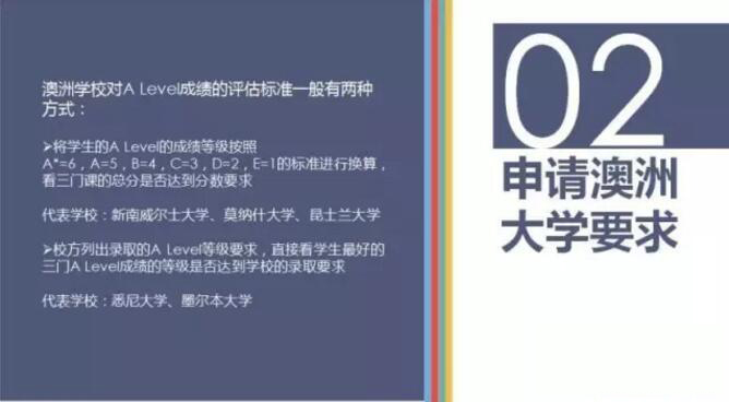 A-Level申请澳大利亚大学的要求。在澳洲不同大学不同专业,对A-Level成绩的录取要求并不一样。澳洲学校对成绩的评估标准一般有两种方式。一种是将学生的A-Level的成绩等级按照A*=6,A=5,B=4,C=3,D=2,E=1的标准进行换算,看三门课的总分是否达到分数要求,代表学校:新南威尔士大学、莫纳什大学、昆士兰大学。还有一种校方列出录取的A-Level等级要求,直接看学生最好的三门A-Level成绩的等级是否达到学校的录取要求,代表学校:悉尼大学、墨尔本大学。接下来我们会详细介绍新南威尔士大学和墨尔本大学的要求。