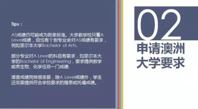 A-Level申请澳洲大学时有一些需要注意的地方。AS成绩仍可能成为衡量标准。大多数学校只看最终递交的A-Level成绩,但也有个别专业会对AS成绩有要求,例如墨尔本大学Bachelor of Arts。部分专业对A-Level的科目有要求,如墨尔本大学的Bachelor of Engineering,要求学生提供数学或者生物、化学任意一门的A -Level成绩。语言成绩同样很重要,除A-Level成绩外,学生还需要提供符合学校要求的雅思或托福成绩,基本要求是雅思均分6.5单科不低于6,也有部分专业的雅思成绩要求更高。
