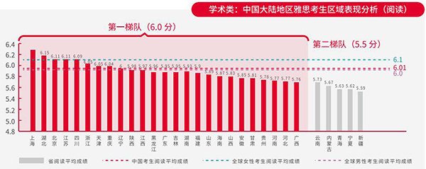 在有效样本量达到500以上的30个省份/直辖市中, 共有25个省/市雅思考生的阅读平均分与全球平均分属于同一分数梯队,其中上海、湖北、北京、江苏的雅思考生阅读平均分已超过全球平均分。