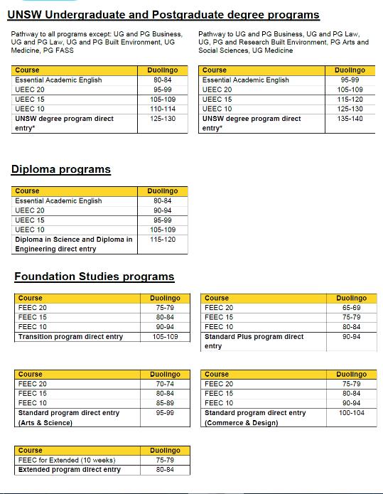 持有有效的雅思考试,PTE,托福和剑桥考试成绩,并持有有效的UNSW录取通知书的学生,不得使用Duolingo成绩进入其他要求更高成绩的课程。