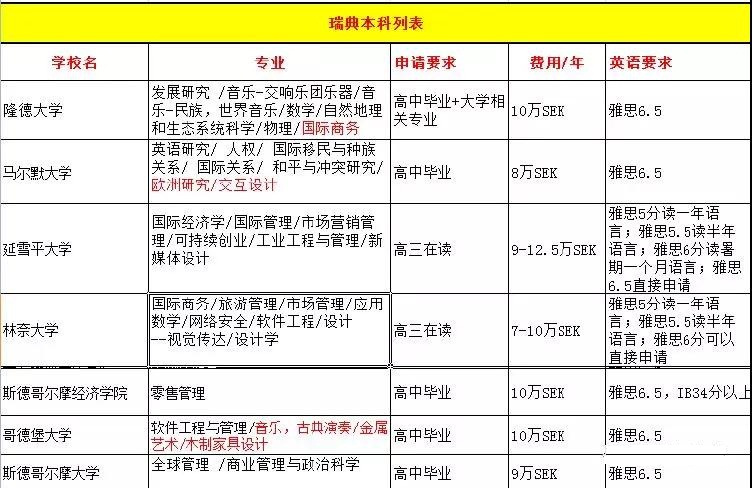 比如隆德大学,斯德哥尔摩大学,严雪萍大学,哥德堡大学,马尔默大学都有在本科阶段开设英语授课的专业。
